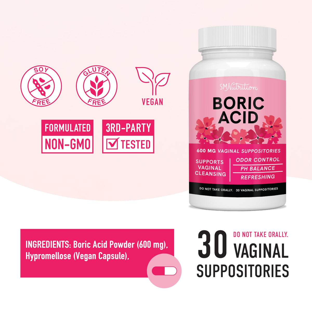 Boric Acid Suppositories for Women | 600mg | for pH Balance, Vaginal Odor & Itching | Feminine Hygiene