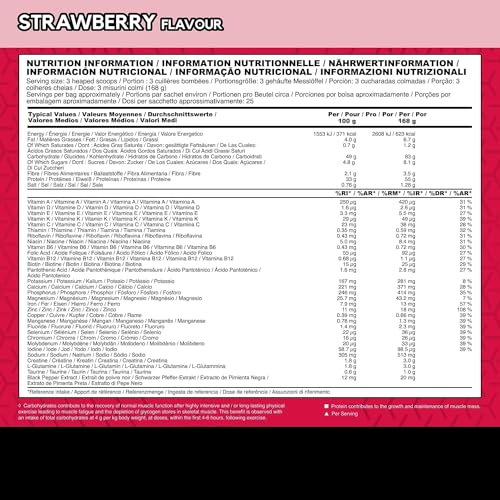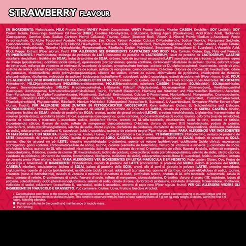 maltodextrin, milk protein blend( WHEY PROTEIN CONCENTRATE, WHEY PROTEIN ISOLATE, MICELLAR CASEIN, emulsifier( SOY LECITHIN)), SOY PROTEIN ISOLATE, flavourings, sunflower oil powder( MILK), creatine monohydrate, L-glutamine, bulking agent( Polydextrose), acids( citric acid), thickeners( carrageenan, xanthan gum, sodium carboxymethylcellulose), Taurine, colourants( beetroot red), vitamin & mineral blend( sodium L-ascorbate, ferric pyrophosphate, DL-alpha tocopheryl acetate, Nicotinamide, Zinc Oxide, retinyl acetate, calcium D-pantothenate, sodium fluoride, manganese sulphate, cyanocobalamin, D-biotin, chromium(III)chloride hexahydrate, potassium iodide, cholecalciferol, pteroylmonoglutamic acid, sodium selenite, cupric citrate, pyridoxine hydrochloride, thiamine hydrochloride, phytomenadione, Riboflavin, sodium molybdate), sodium chloride, sweeteners( acesulfame potassium, sucralose), L-ascorbic acid, black pepper extract( Piper Nigrum)
