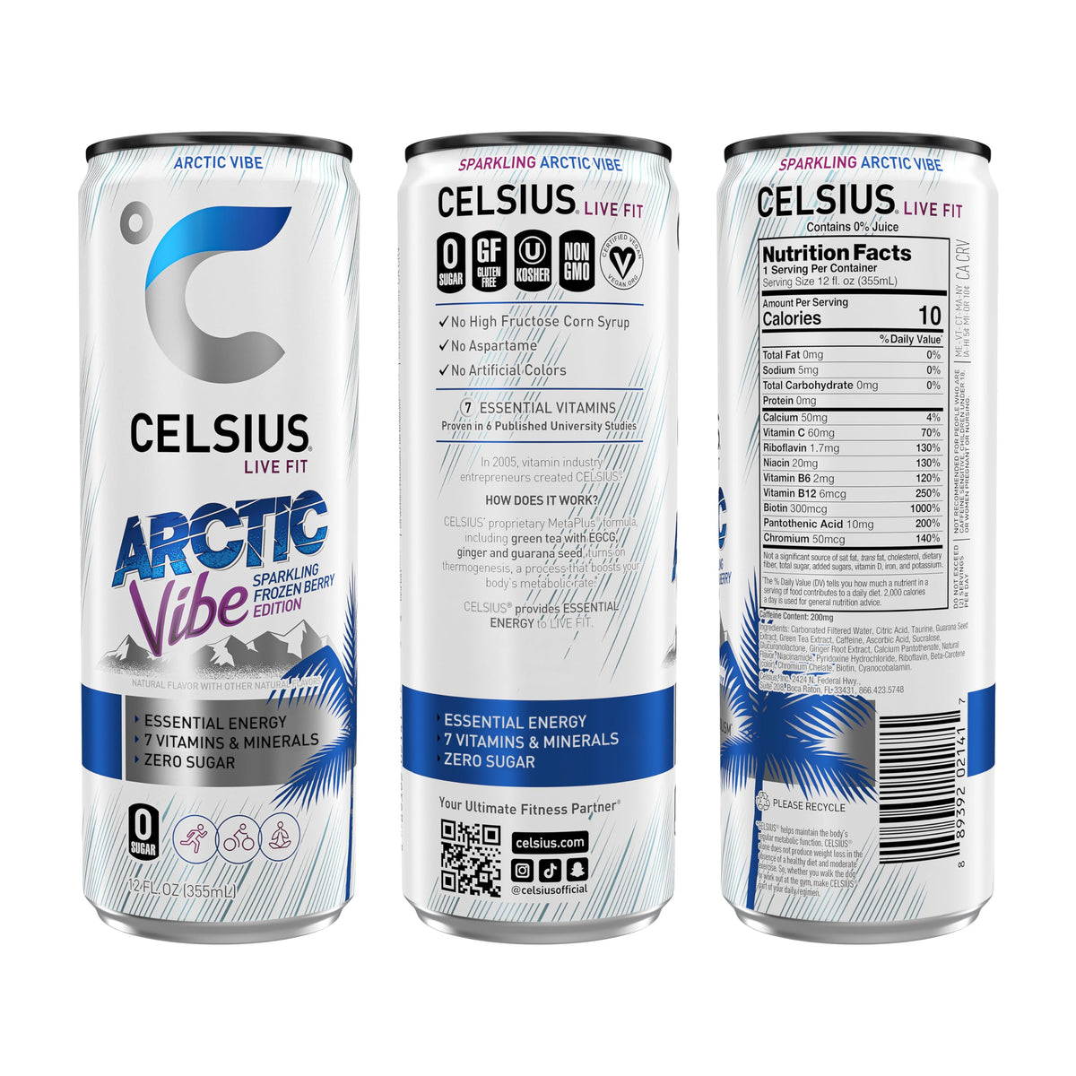 Details: CELSIUS is functional, Essential Energy, a better-for-you, premium alternative to traditional energy drinks. As a global, lifestyle fitness drink, CELSIUS was created to help people LIVE FIT, exceed their goals and elevate their everyday lives. Our CELSIUS VIBE Essential Energy Drinks feature bold flavor combinations that transport you beyond the can to amazing global destinations that inspire us all. From sunny, tropical beaches, to snowy mountainscapes. What’s your vibe? Made with proven, premium ingredients, 7 Essential Vitamins and zero sugar, no artificial colors, no aspartame, no high fructose corn syrup and non-GMO. CELSIUS is vegan, gluten-free and Kosher. Our proprietary MetaPlus blend contains green tea extract with EGCG. It also includes guarana seed extract, ginger root for flavor and digestion, vitamin C to help support your immune system, vitamin B for energy production, and chromium to help control hunger, making it an ideal pre-workout drink. CELSIUS Sparkling Arctic Vibe packs an icy chill of refreshing Frozen Berry flavor that will keep you cool and energized all summer long. Make CELSIUS your go-to choice for Essential Energy! CELSIUS is available in 12 oz. slim cans and sold in a 12-pack for convenience.