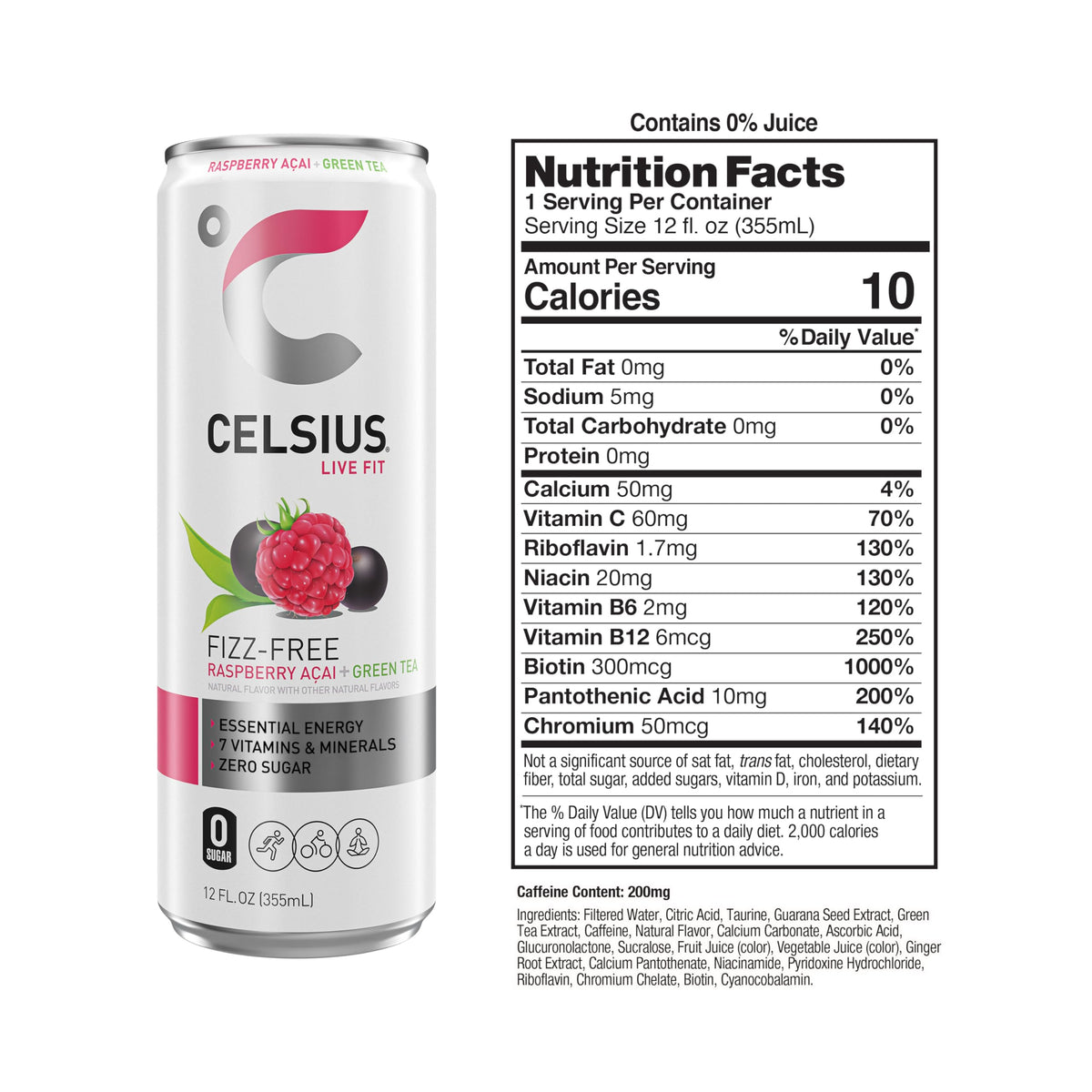 CELSIUS Raspberry Acai Green Tea, Functional Essential Energy Drink 12 Fl Oz (Pack of 12) Packaging may vary
