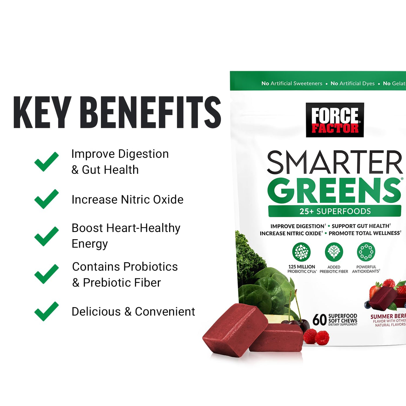 FORCE FACTOR Smarter Greens Superfood Chews, Greens and Superfoods with Probiotics, Antioxidants, and Fiber, Greens Supplement to Support Digestion, Nitric Oxide, and Energy, 60 Soft Chews