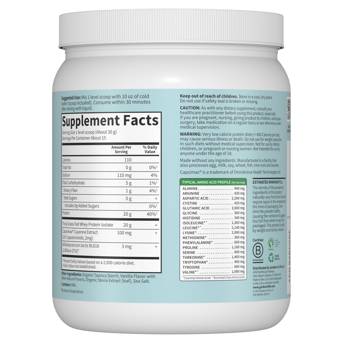 Details: Garden of Life Grass Fed Whey+ Weight Management is a delicious, vanilla-flavored, easy-to-mix protein powder for weight management and metabolism support, plus support for improved performance.† This thoughtfully formulated weight management protein includes 100 mg of clinically studied Capsimax® (Cayenne Extract) to kickstart your metabolism and enhance the body composition benefits of your reduced calorie diet and regular exercise program, so you can enjoy added aesthetic benefits while you fuel your sport... and your busy lifestyle.† It's NSF Certified for Sport®, which means it does not contain any substances banned by major athletic organizations. From your nature walk to your gold medal—and everything in between— Whey+ Weight Management is the next generation of grass-fed whey protein powder, here to support the inner athlete in you. †These statements have not been evaluated by the Food and Drug Administration. This product is not intended to diagnose, treat, cure or prevent any disease."