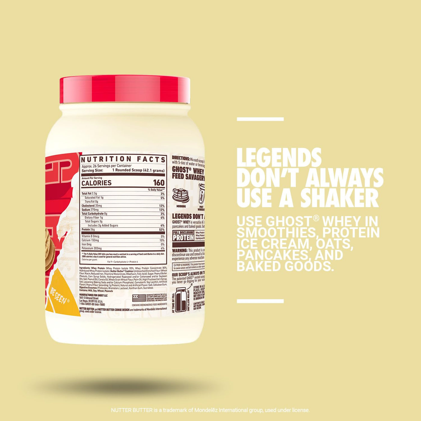 GHOST Whey Protein Powder, Nutter Butter - 2LB Tub, 26G of Protein - Peanut Butter