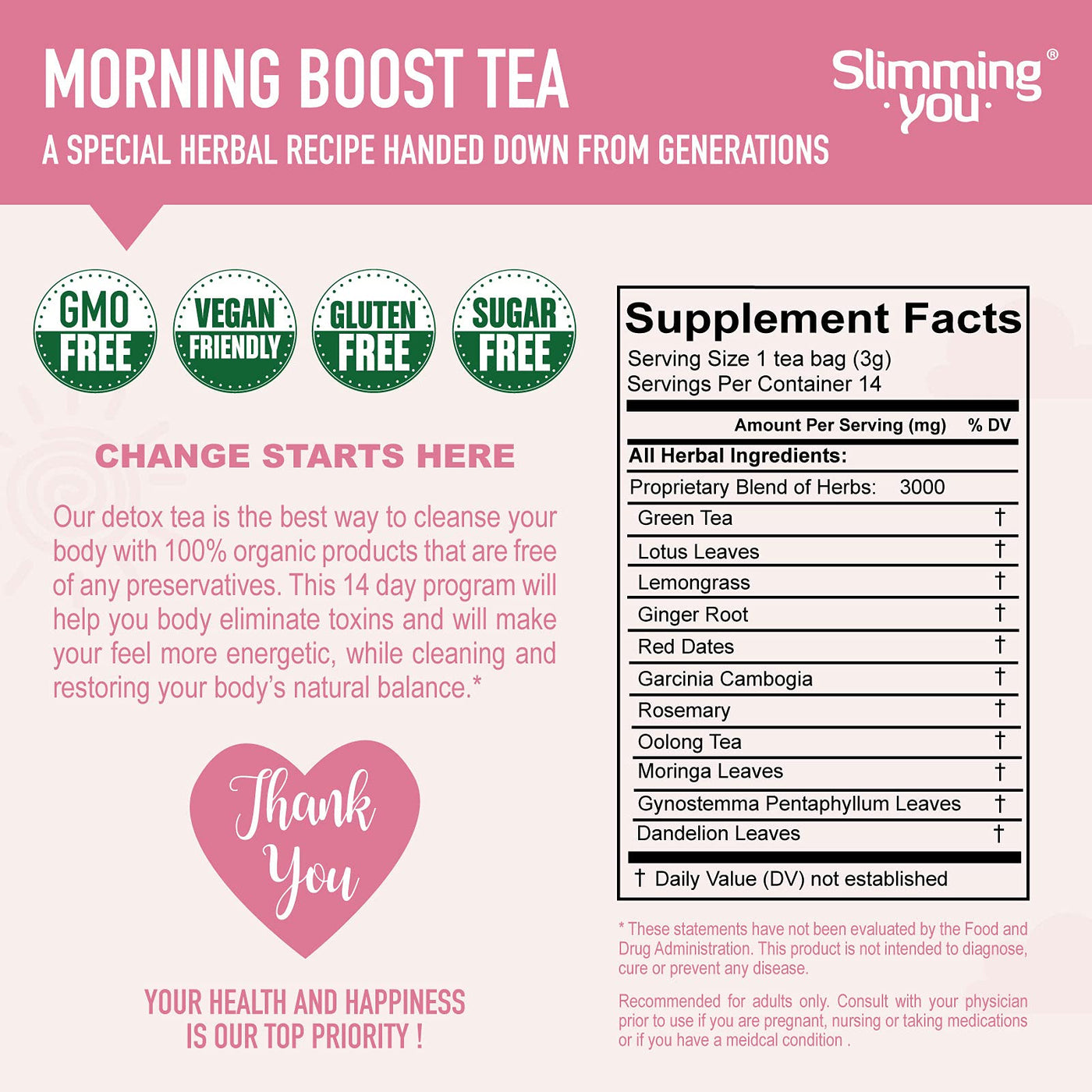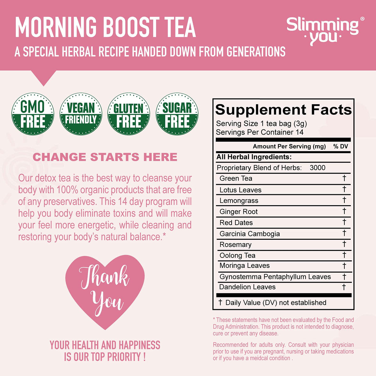 - 🍵2-STEP TEA DETOX - Slimming You detox tea uses a 2-step method. For maximum benefits, drink a cup of detox tea first thing in the morning. It energizes you as you prepare for the day ahead; Drinking evening tea at night before bed can boost your digestive system's ability.