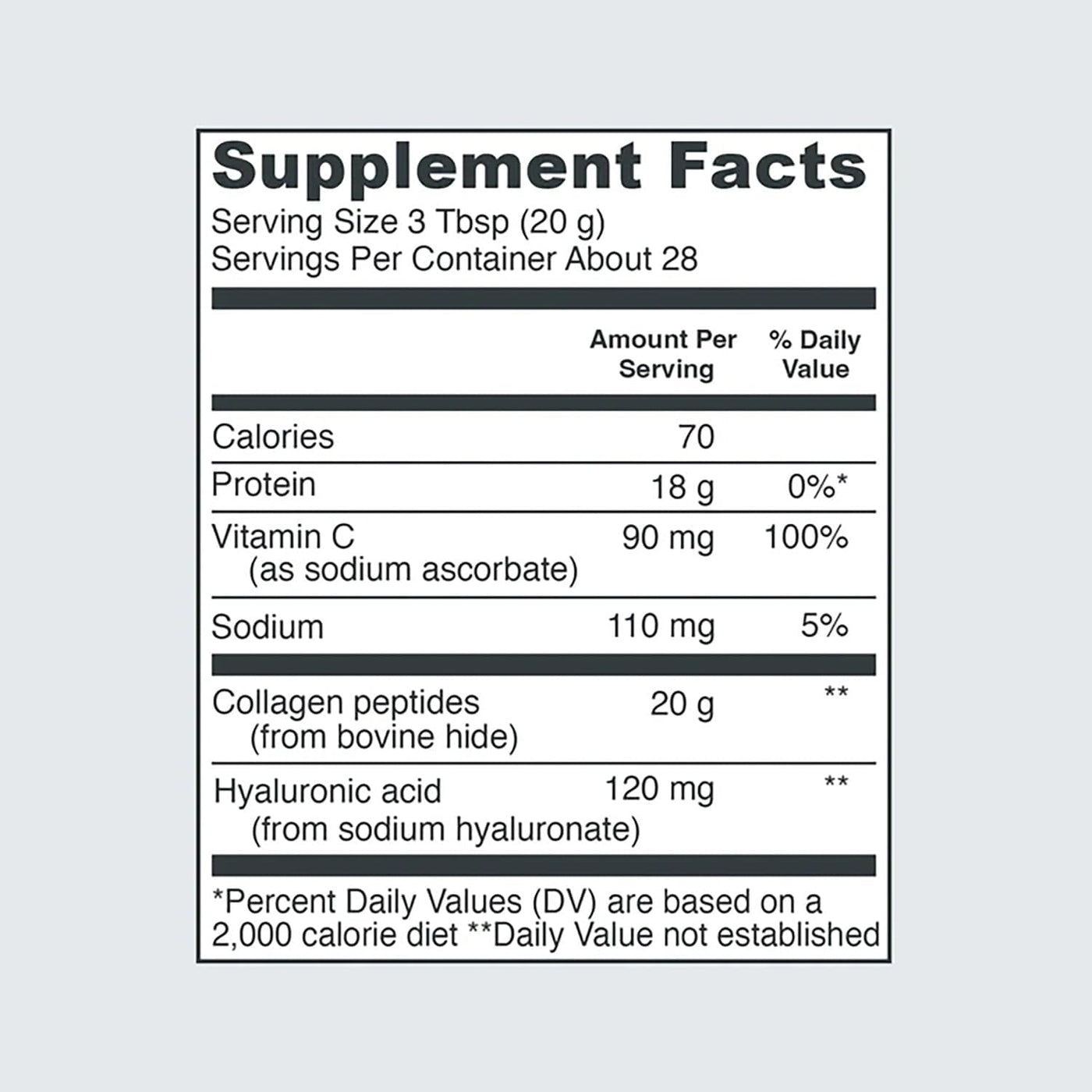 - Vital Proteins Collagen Peptides Advanced is a premium offering with 20g collagen peptides per serving plus two additional functional ingredients – 100% daily value vitamin C and 120 mg hyaluronic acid. Vitamin C helps to support the body’s natural collagen production while hyaluronic acid helps to improve skin hydration and joint mobility.**^ Our product quantity is based on weight, not canister size.
