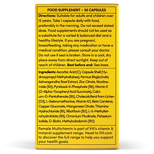 - FEMALE MULTIVITAMIN: A comprehensive daily multivitamin tailored to support overall female wellbeing. Providing a daily dose of vitamins and minerals including Biotin, Zinc, Calcium, Iron and Vitamins D, C, E and B12 along with Manganese and Folic Acid.