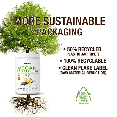 - 50% RECYCLED PACKAGING: Because at Weider we want to be greener, we usde for our VEGAN PROTEIN a 50% recycled, 100% recyclable packaging, with a CleanFlake label solution to facilitate plastic recycling.