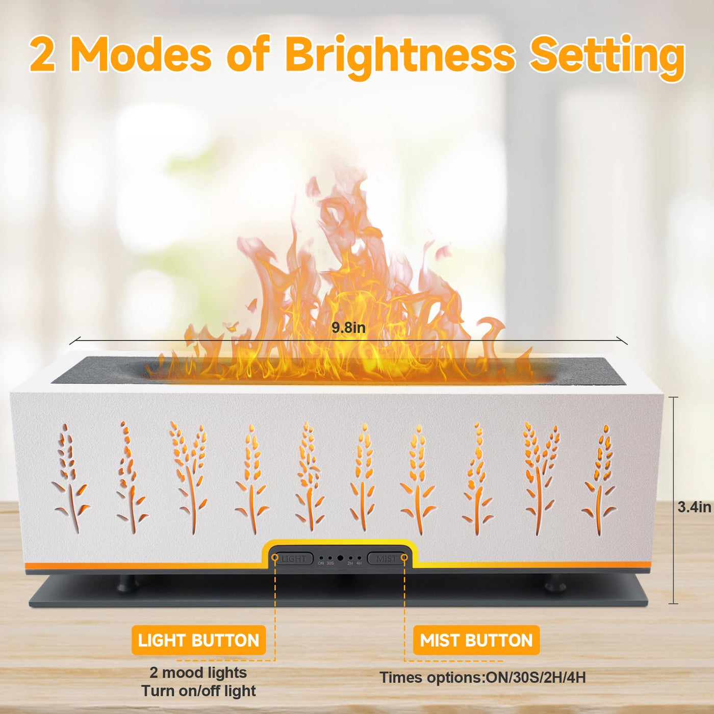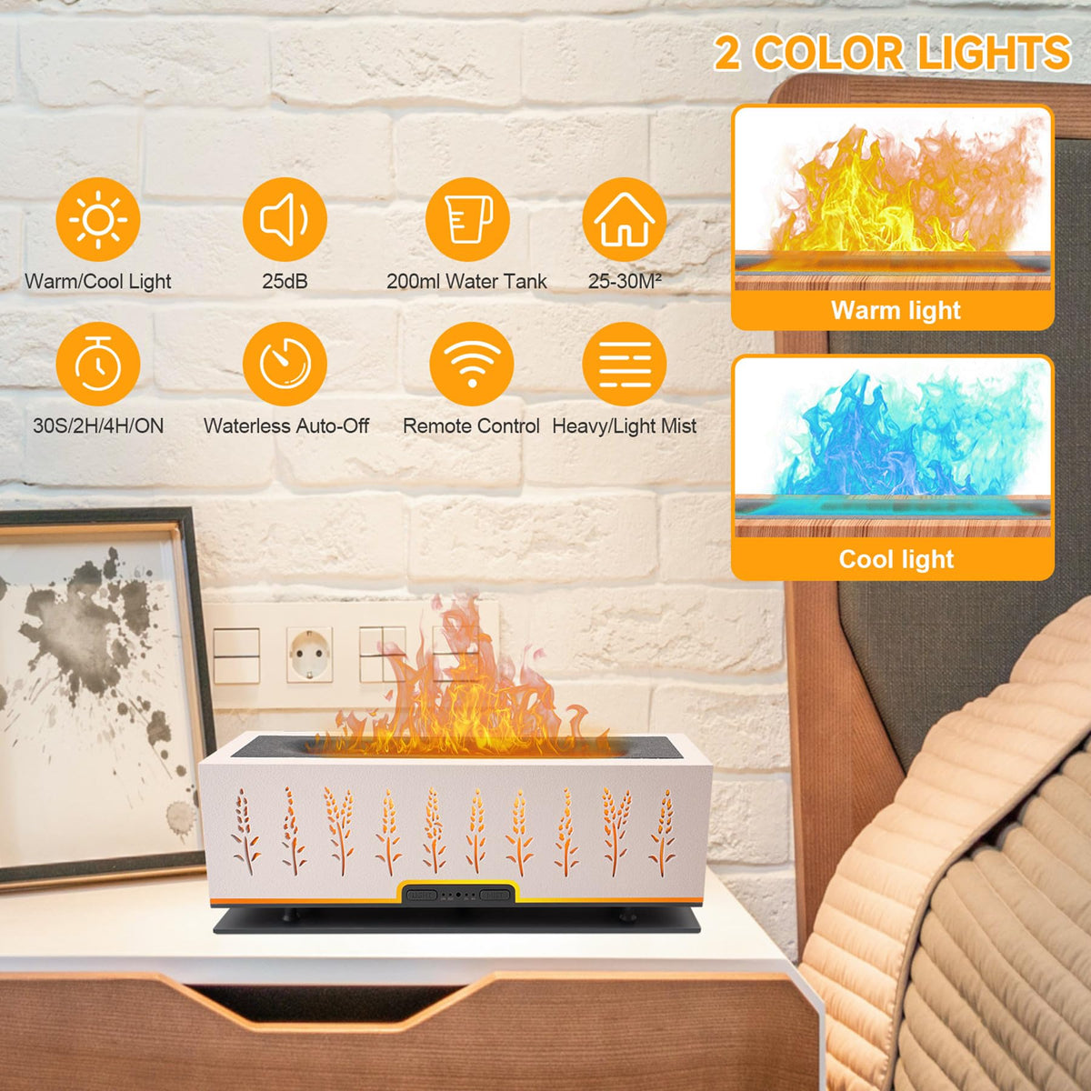 - Work Modes---The ultrasonic aromatherapy diffuser has 30/120/240 minute timers and steady ON mode to meet daily diversified needs.The Oil diffuser with 200ml water tank allows you to humidify continuously up to 12 hours. 2 different LED light colors, kinds of atomization mode, respectively strong/weak/intermittent/continuous mist, the mist and light functions of flame diffuser work separately.