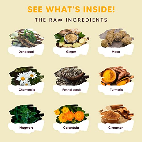 Each ingredient has many beneficial properties to help ease tension, cramping, bloating, fatigue and irritability. With ingredients such as dong quai, ginger, organic maca, chamomile, fennel seeds, organic turmeric, vanilla, mugwort, calendula, stevia and cinnamon, this tea is good to the last sip.