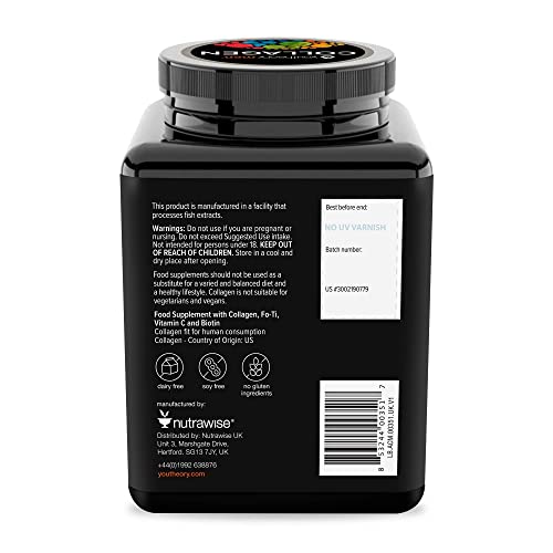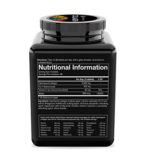 Ingredients: Hydrolyzed collagen; bulking agent: calcium carbonate; Fo-Ti root extract (Polygonum multiflorum); bulking agent: dicalcium phosphate; anticaking agent: magnesium salts of fatty acids; D-biotin; vitamin C (calcium-L-ascorbate); anticaking agent: silicon dioxide.